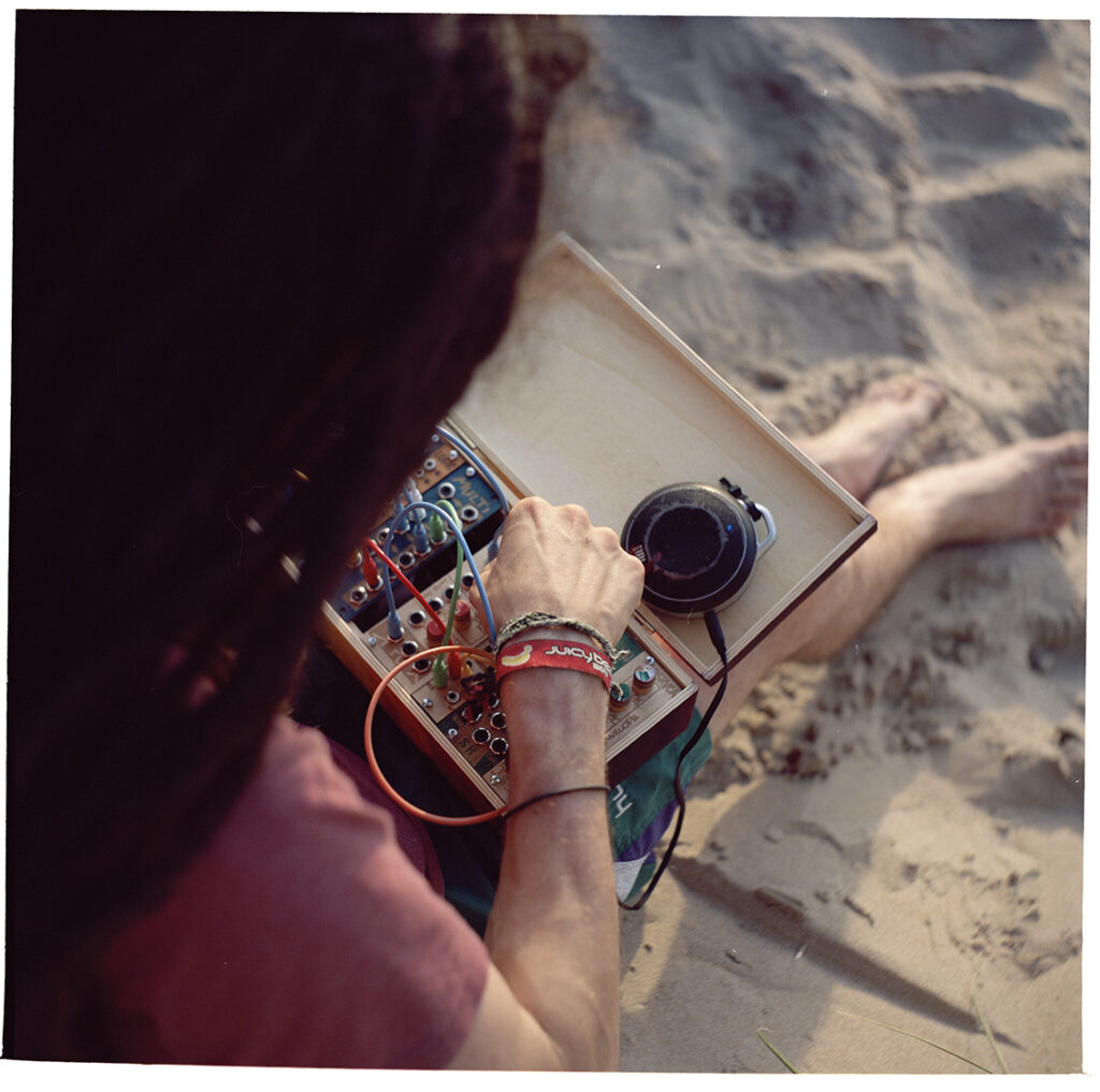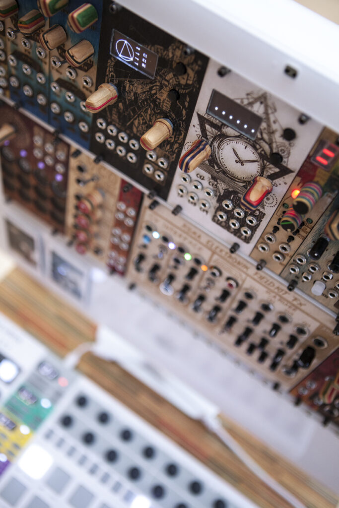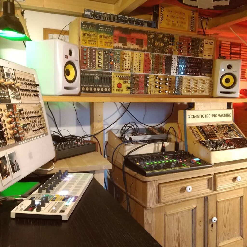 I was looking for an „non-PC Instrument“, that can produce Techno Sounds for the „Kinetic Techno Machine“. My research brought me to the modularsynthesizers. A fully analog electronic Instrument (like a e-guitar with much more possibilities) was developed in the 1960s and in the late 80s the startpoint for technomusic.